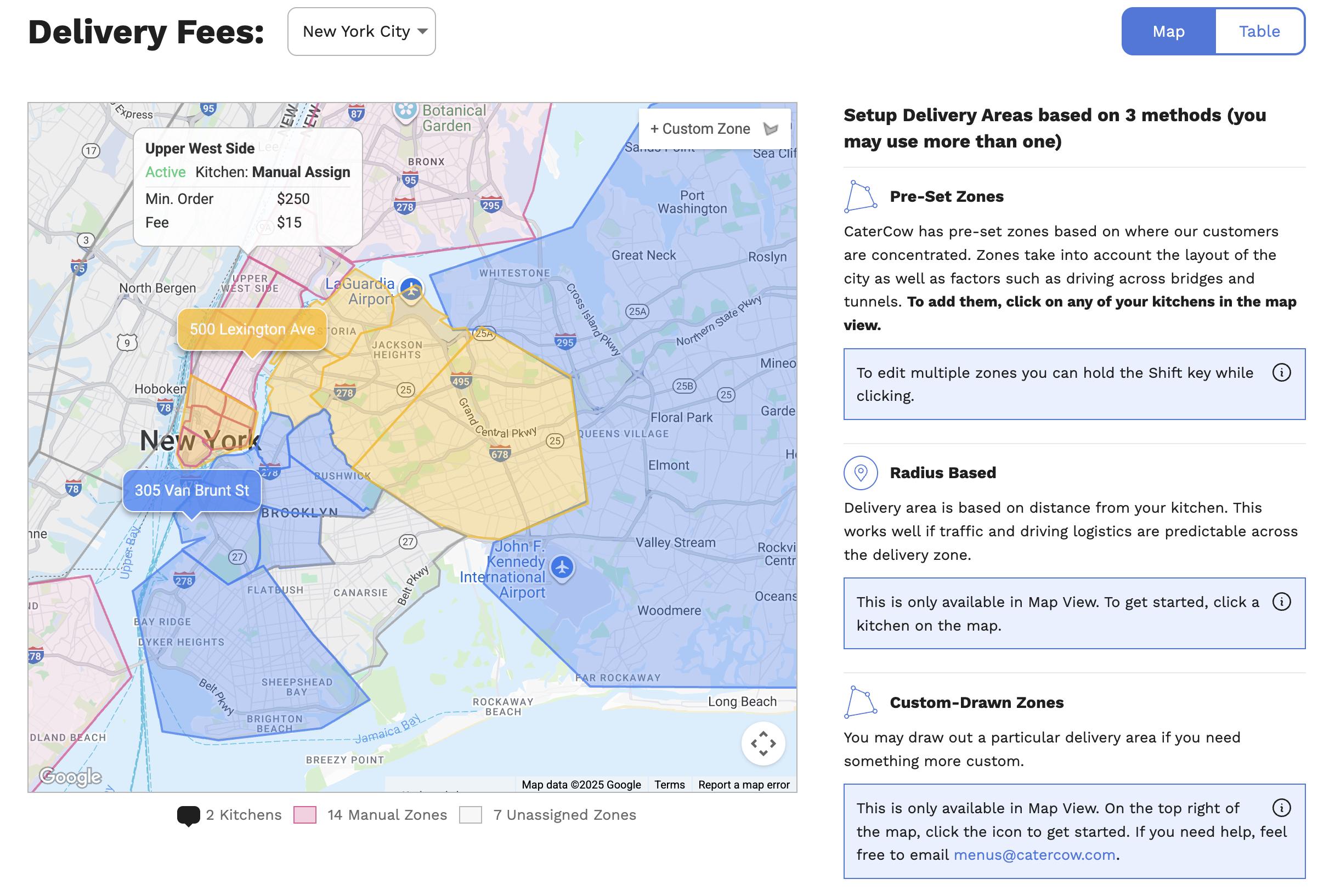 Draw custom polygon delivery zones on a map. Orders are automatically routed to the correct location based on the delivery address falling within your custom zones. Central dispatchers can manually reassign orders for load balancing.
